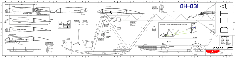 Short kit : 259.00 EUR Short-kit. (see ordering). Contains printed plans rolled, cut sheet parts. Balsa ribs for wing and plywood parts for fuselage + plywood wing ribs. Includes also aluminium strip for landing skid protection. Does not include strips or torsion sheeting or stripwood for fuselage. |