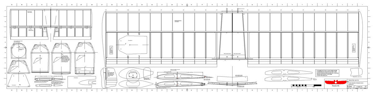 ns. Short-kit (kts. tilaaminen). Sisältää tulostetut, rullatut piirustukset, valmiiksi muotoon leikatut levymäiset puu-osat (balsa, vaneri), ei sisällä rimoja tai torsioita yms. |